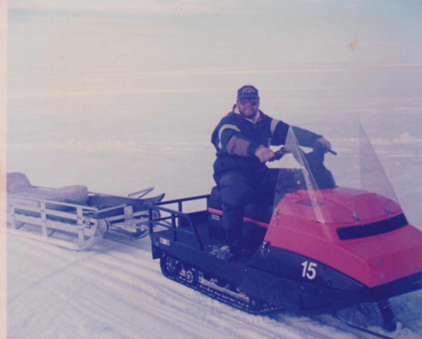 This image is part of a collection of images contributed by Mustakim Gierdien. This contribution is linked to his story published by ALSA: “ From district Six to Antarctica”. The publication, written by Mustakim Gierdien, a retired employee of the Department of Public Works and Infrastructure (DPWI), is a deeply personal narrative. It chronicles Mustakim's journey from his early years growing up in District Six, Cape Town, to his eventual involvement in the Antarctic and Island programme through DPWI. This story is not fictional. It is told entirely in Kim's own words, reflecting his personal experiences, views, and emotions. The perspectives presented are his alone and do not necessarily represent those of ALSA, SANAP, or affiliated institutions such as the Department of Forestry, Fisheries and the Environment (DFFE), the Department of Science, Technology and Innovation (DSTI), the National Research Foundation (NRF), or DPWI. Image description: Mustakim Gierdien on skidoo with passenger sled to cart team members around site or to transport food rations from underground fridges to chef’s kitchen.