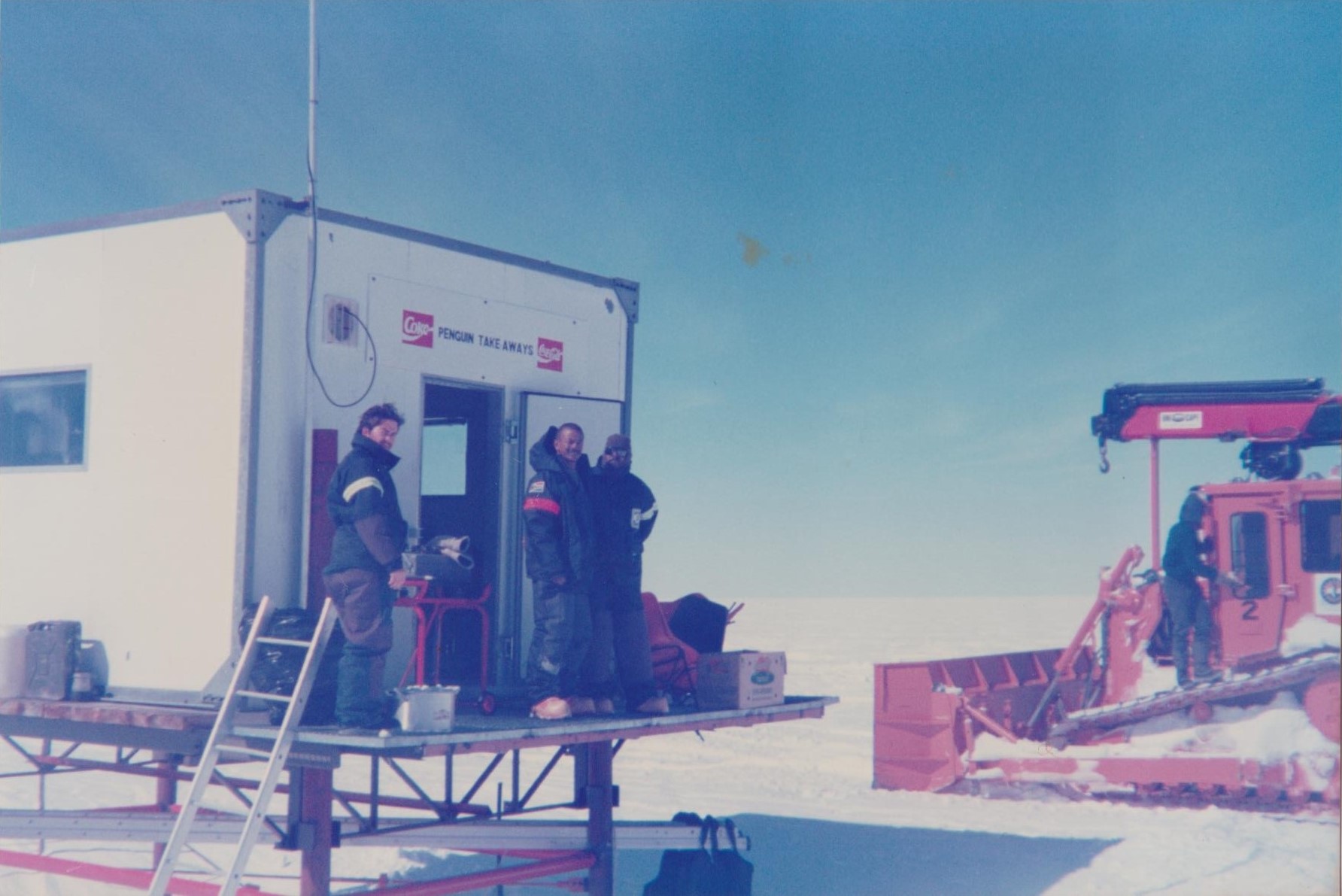 This image is part of a collection of images contributed by Mustakim Gierdien. This contribution is linked to his story published by ALSA: “ From district Six to Antarctica”. The publication, written by Mustakim Gierdien, a retired employee of the Department of Public Works and Infrastructure (DPWI), is a deeply personal narrative. It chronicles Mustakim's journey from his early years growing up in District Six, Cape Town, to his eventual involvement in the Antarctic and Island programme through DPWI. This story is not fictional. It is told entirely in Kim's own words, reflecting his personal experiences, views, and emotions. The perspectives presented are his alone and do not necessarily represent those of ALSA, SANAP, or affiliated institutions such as the Department of Forestry, Fisheries and the Environment (DFFE), the Department of Science, Technology and Innovation (DSTI), the National Research Foundation (NRF), or DPWI. Image description: The Penguin Take Aways being raised to withstand snow build up for a year. Bulldozer driver having enjoyed a snack from the Take Aways. Mustakim Gierdien, Shaheem and ''Pikkewyn'' on the catwalk in front of the Take Aways.