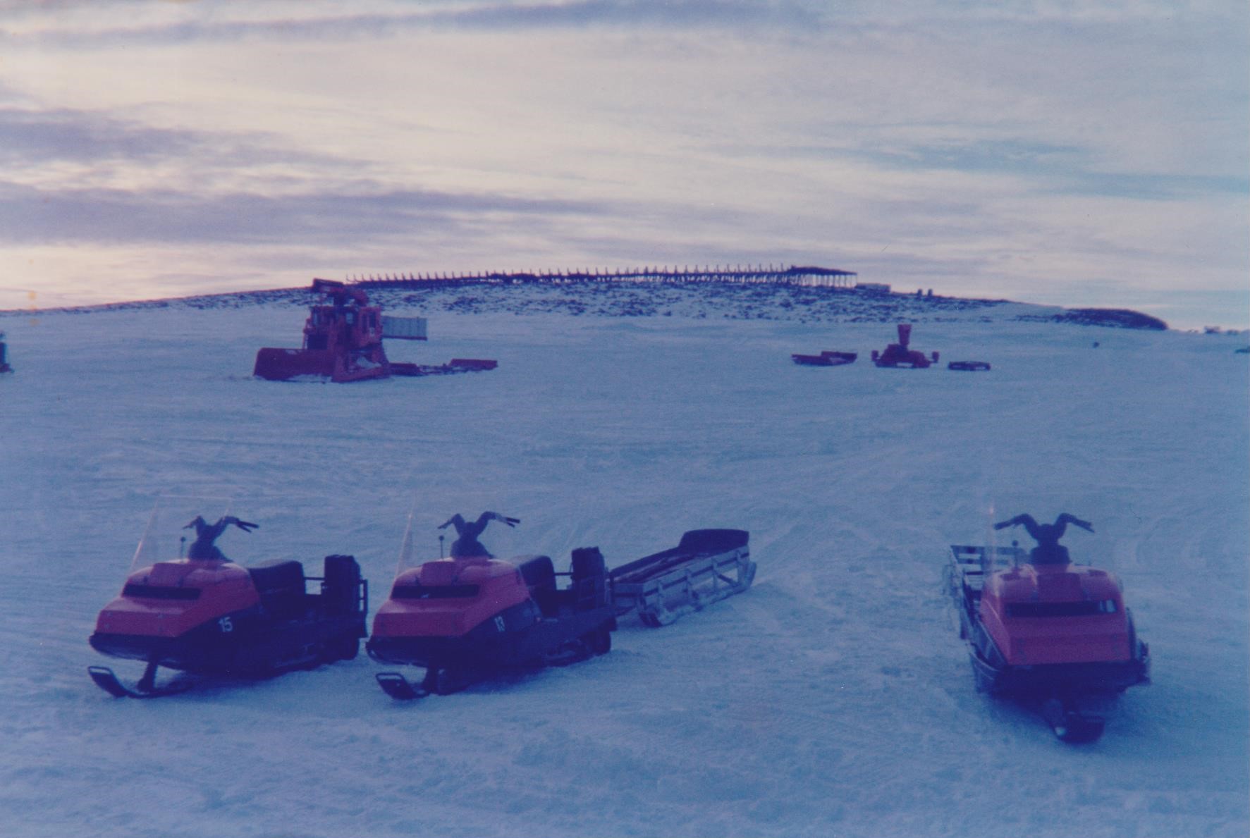 This image is part of a collection of images contributed by Mustakim Gierdien. This contribution is linked to his story published by ALSA: “ From district Six to Antarctica”. The publication, written by Mustakim Gierdien, a retired employee of the Department of Public Works and Infrastructure (DPWI), is a deeply personal narrative. It chronicles Mustakim's journey from his early years growing up in District Six, Cape Town, to his eventual involvement in the Antarctic and Island programme through DPWI. This story is not fictional. It is told entirely in Kim's own words, reflecting his personal experiences, views, and emotions. The perspectives presented are his alone and do not necessarily represent those of ALSA, SANAP, or affiliated institutions such as the Department of Forestry, Fisheries and the Environment (DFFE), the Department of Science, Technology and Innovation (DSTI), the National Research Foundation (NRF), or DPWI. Image description: Picture taken after supper showing skidoos and crane bulldozer with its 21-foot sled parked for the night. Vehicles parked against any oncoming snow storm to reduce massive sastrugi build up. Bottom section of SANAE IV ribcage and its supporting structure almost entirely completed. Outer layer base of A-Block appears to be complete as well as half of helipad.