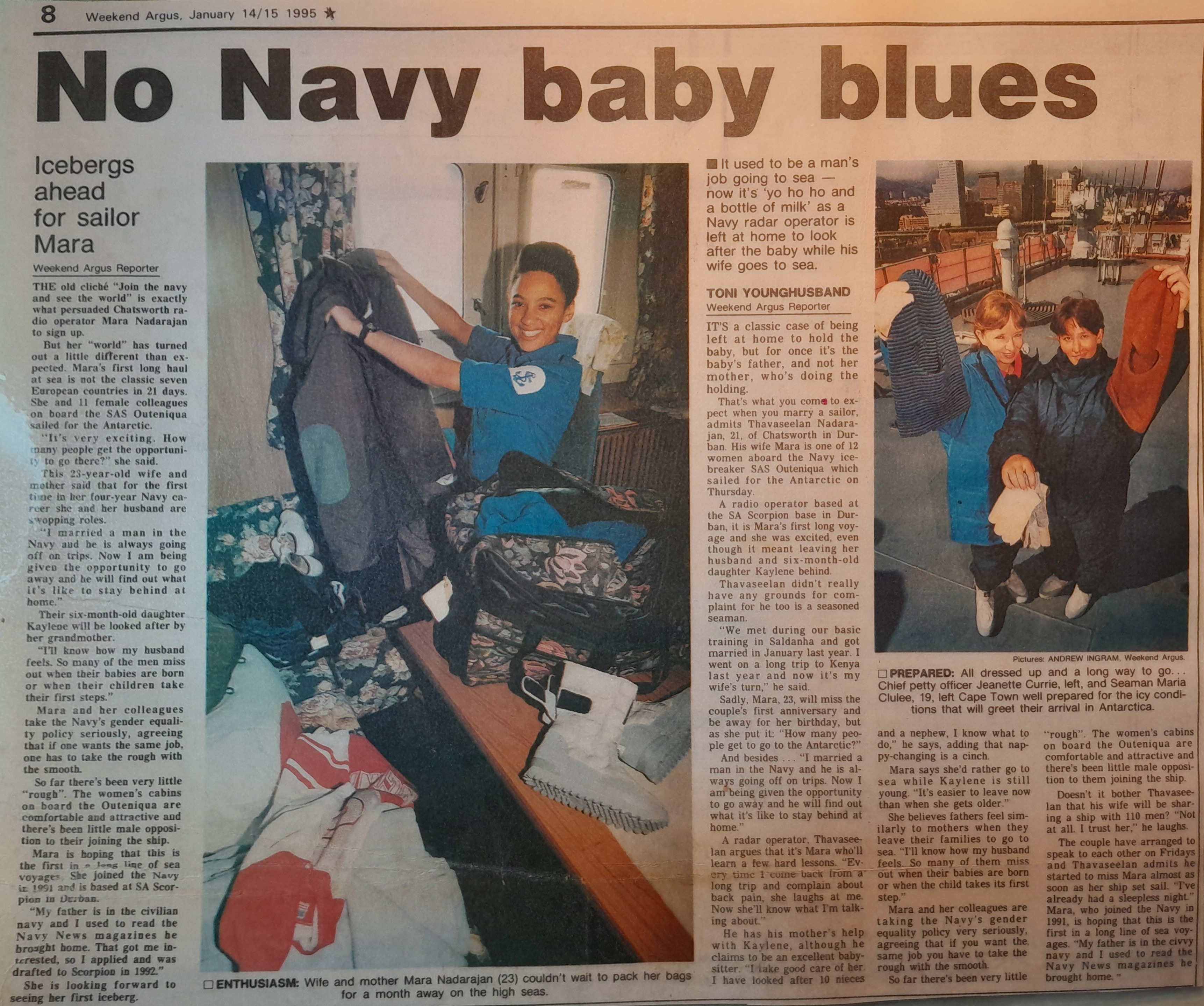 In January 1995, the Weekend Argus profiled Seaman Mara Nadarajan of Durban, one of 12 women aboard the Navy icebreaker SAS Outeniqua on its voyage to Antarctica. It was her first long sea journey, leaving behind her husband, also a Navy radar operator, and their six-month-old daughter. The article highlights the couple’s role reversal, with Mara at sea while her husband stays home, as well as the Navy’s growing gender equality, with women serving alongside men in Antarctic operations. This material is part of a collection contributed by Mustakim Gierdien, that he used for writing his book “ From district Six to Antarctica”, published September 2025 by ALSA.